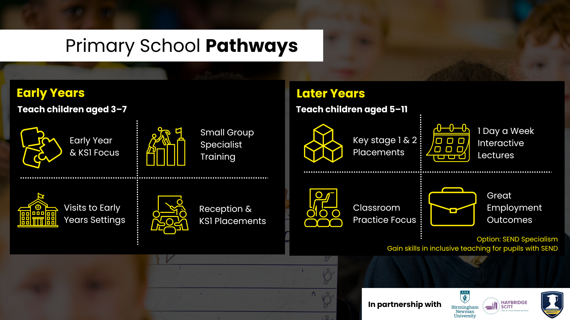 Primary routes focus on the study of teaching in all Primary National Curriculum subjects, with emphasis on the core subjects: English, Mathematics and Science. Our Primary courses allow applicants the opportunity to study a range of ages, ranging from 3-7 (Early Years, Postgraduate or 5-11 (Postgraduate) and the distinctive pedagogies encountered in Early Years Foundation Stage, Key Stage 1 and Key Stage 2 classrooms, as well as a KS3 experience.